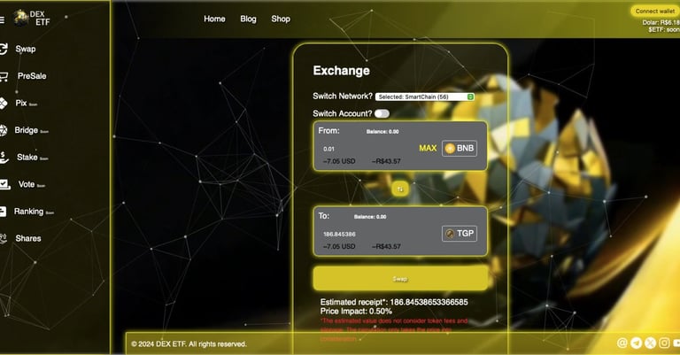 También ofrecemos la cotización del dólar y de nuestro token $ETF en tiempo real, asegurando que siempre tengas la información necesaria para tomar decisiones rápidas y precisas. Todo está pensado para facilitar tus operaciones y maximizar tus ganancias en el mercado cripto, ya seas principiante o trader experimentado.